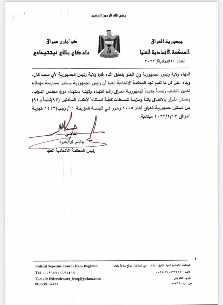 وجاء في نص بيان المحكمة الاتحادية العليا بدول العراق: تجد المحكمة العليا ان رئيس الجمهورية يستمر بممارسة مهماته لحين انتخاب رئيسا جديدا لجمهورية العراق رغم انتهاء ولايته بانتهاء دورة مجلس النواب العراقي.