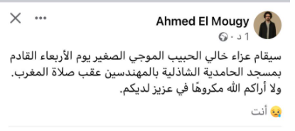 وكتب أحمد الموجي، منشورًا عبر حسابه الشخصي بموقع التواصل الاجتماعي فيسبوك، وقال: سيقام عزاء خالي الحبيب الموجي الصغير يوم الأربعاء المقبل بمسجد الحامدية الشاذلية بالمهندسين عقب صلاة المغرب ولا أركم الله مكروها في عزيز لديكم.
