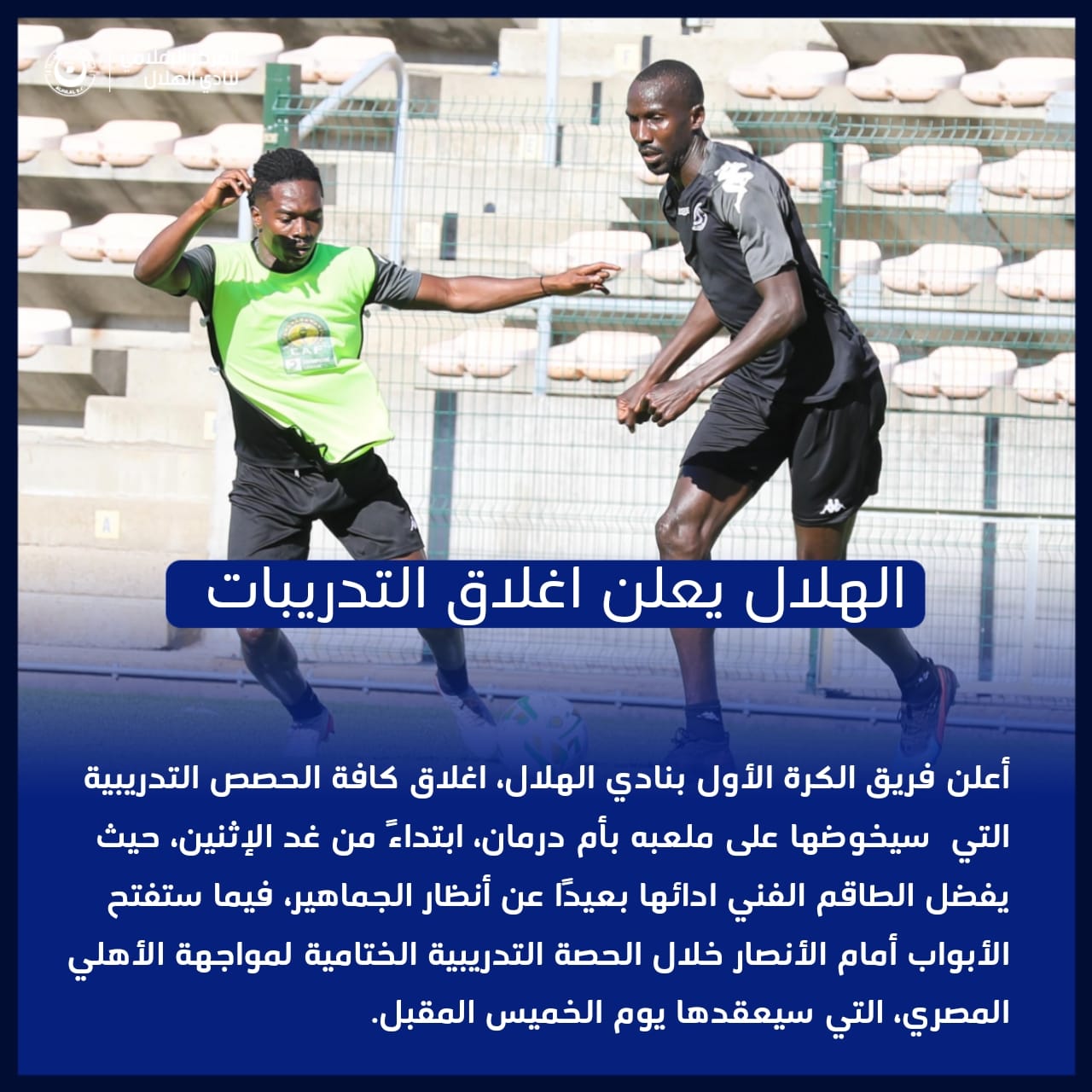 وجاء نص بيان الهلال على النحو التالي: أعلن فريق الكرة الأول بنادي الهلال، إغلاق كافة الحصص التدريبية التي سيخوضها على ملعبه بأم درمان، بداية من غد الاثنين، حيث يفضل الطاقم الفني أدائها بعيدًا عن أنظار الجماهير، فيما ستفتح الأبواب أمام الأنصار خلال الحصة التدريبية الختامية قبل مواجهة الأهلي المصري، التي سيعقدها يوم الخميس المقبل.