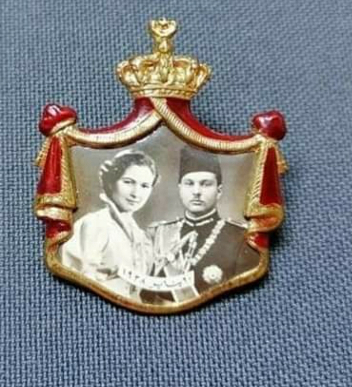 وتعرض هذه القطعة لأول مرة، وهي عبارة عن دبوس مطلي بالذهب، وتتوسطه صورة للملك فاروق الأول والملكة فريدة؛ يعلوها التاج الملكي، ويحمل تاريخ 20 يناير 1938.