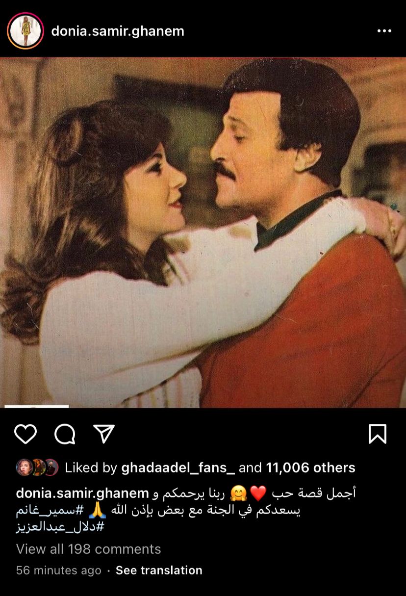 ونشرت دنيا سمير غانم، صورة لوالديها، عبر حسابها الشخصي بموقع تبادل الصور والفيديوهات القصيرة إنستجرام، وعلقت عليها: أجمل قصة حب، ربنا يرحمكم ويسعدكم، في الجنة مع بعض بإذن الله.