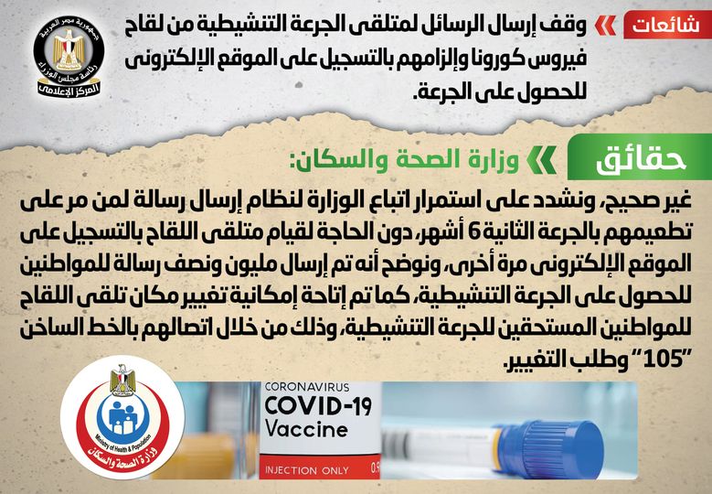 وشددت وزارة الصحة والسكان، على استمرار إتباع الوزارة لنظام إرسال رسالة لمن مر على تطعيمهم بالجرعة الثانية 6 أشهر، دون الحاجة لقيام متلقي اللقاح بالتسجيل على الموقع الإلكتروني مرة أخرى، مُوضحةً أنه تم إرسال مليون ونصف رسالة للمواطنين للحصول على الجرعة التنشيطية، كما تم إتاحة إمكانية تغيير مكان تلقي اللقاح للمواطنين المستحقين للجرعة التنشيطية، وذلك من خلال اتصالهم بالخط الساخن "105" وطلب التغيير.