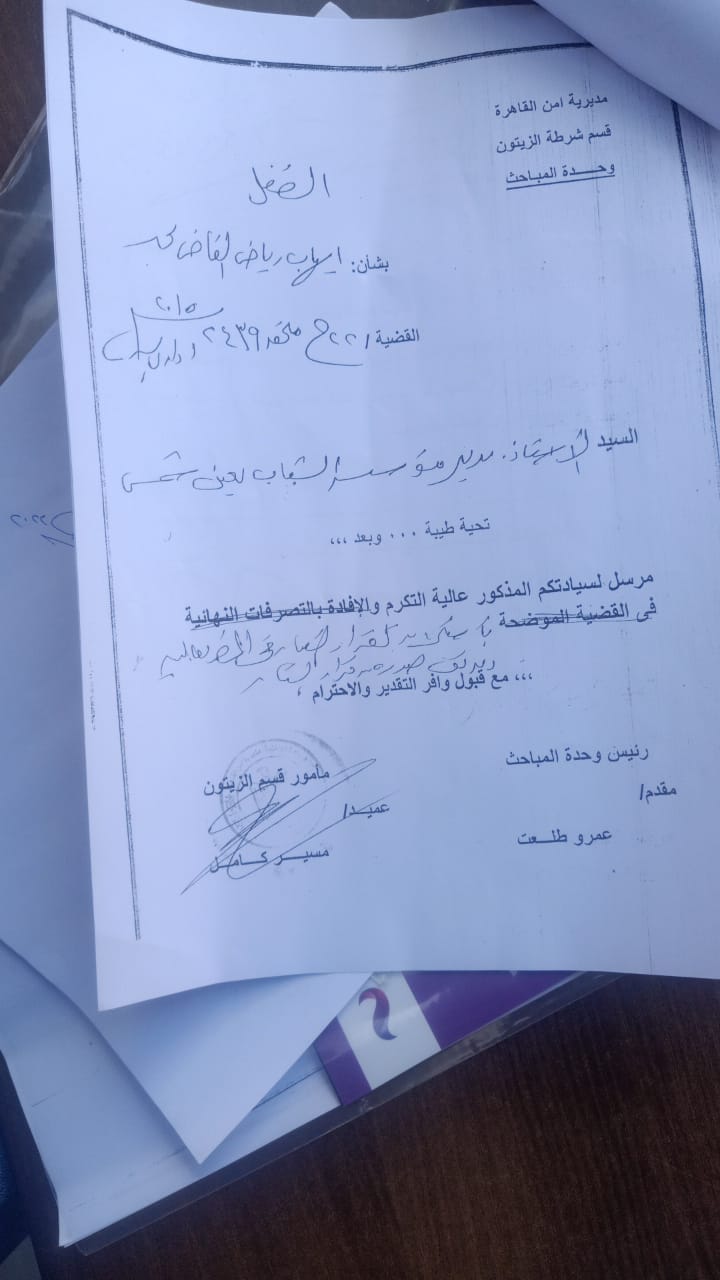 يظهر خطاب موجه من مباحث قسم الزيتون إلى مدير مؤسسة الشباب في عين شمس، يفيد بضرورة تسلم الطفل إيهاب رياض القاضي، المتهم في القضية 22 ح ملحق 2439 لسنة 2015 إداري، ومرفق معه قرار النيابة العامة بتاريخ 22 سبتمبر 2015، والتي قررت فيها إيداع الطفل إيهاب رياض إحدى دور الرعاية الاجتماعية المتخصصة لرعاية الأيتام وتوفير الرعاية الصحية له.