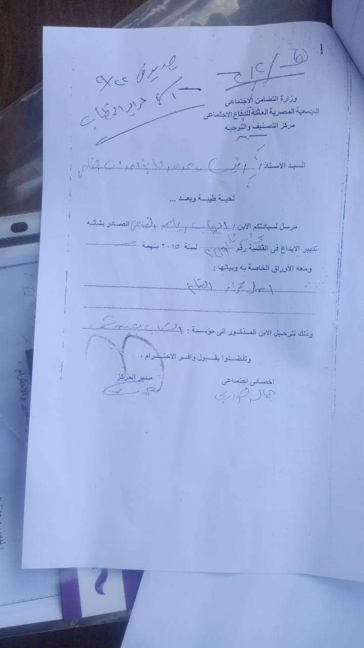 حصلنا على خطاب صادر عن الجمعية المصرية العامة لدفاع الاجتماعي، التابعة لوزارة التضامن الاجتماعي، موجه إلى رئيس وحدة رعاية أحداث القاهرة، يفيد بإرسال الجمعية الطفل إيهاب رياض الصادر بشأنه تدبير الإيداع في القضية رقم 2439 لسنة 2015 دون ذكر تهمة، ومعه الأوراق الخاصة به. وتم ترحيله إلى مؤسسة الأحداث في عين شمس.