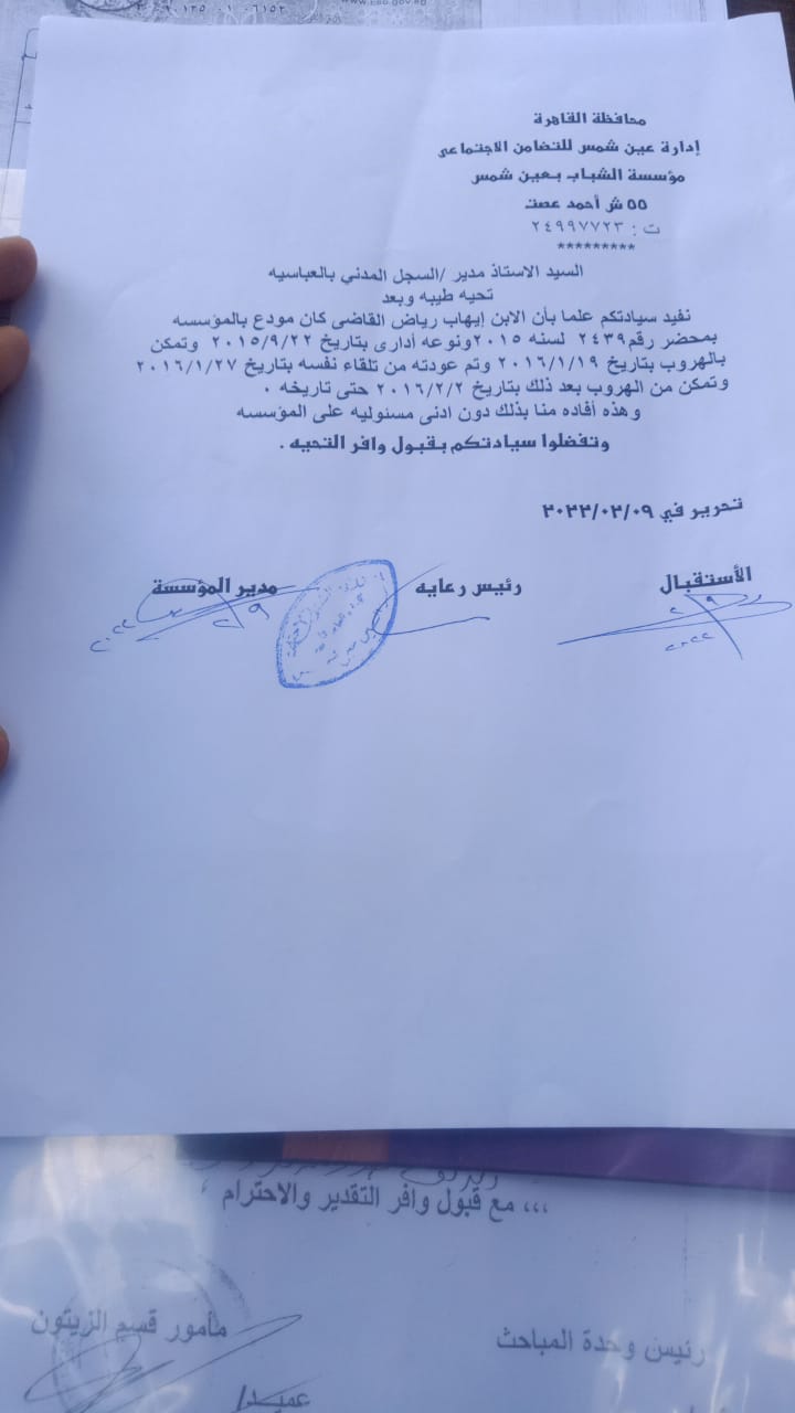 حصلنا على خطاب موجه من مؤسسة الشباب في عين شمس وعنوانها 55 شارع أحمد عصمت، موجه إلى مدير السجل المدني في العباسية، بتاريخ 9 فبراير 2022، يفيد بأن إيهاب كان مودعا في المؤسسة وتمكن من الهروب بتاريخ 19 يناير 2016، وعاد من تلقاء نفسه بتاريخ 27 يناير 2016 وتمكن من الهرب مجددا بتاريخ 2 فبراير 2016 حتى تاريخه.
