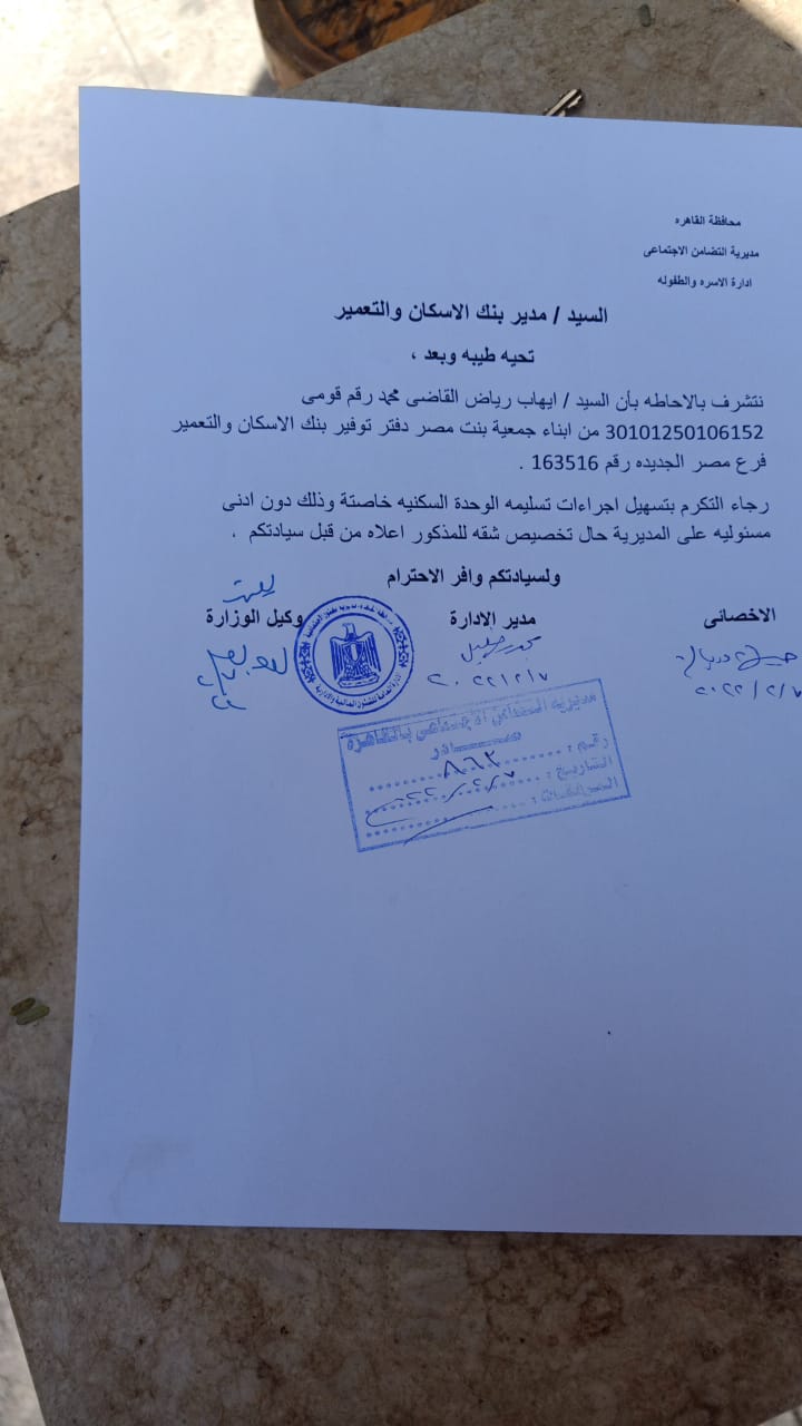 حصل القاهرة 24 على خطاب موجه من مديرية التضامن الاجتماعي إلى مدير بنك الإسكان والتعمير، يفيد بأن الطفل إيهاب رياض أحد أبناء جمعية بنت مصر، ومتوافر له دفتر توفير في بنك الإسكان والتعمير فرع مصر الجديدة رقمه 163516 وبلغ السن القانونية ويحق له تسلم مستحقاته المالية.