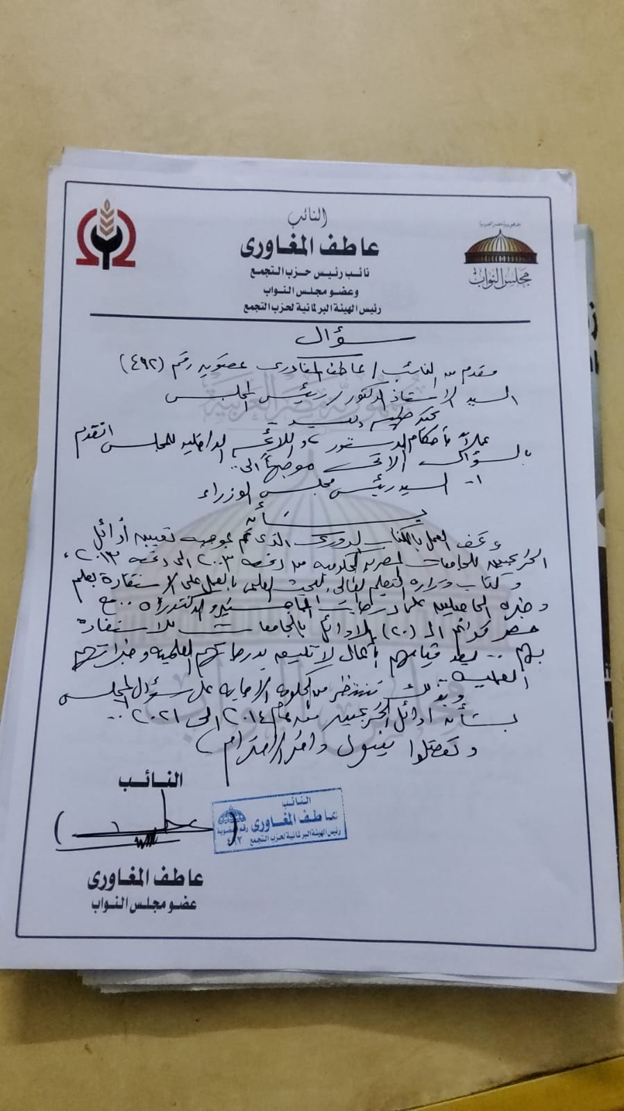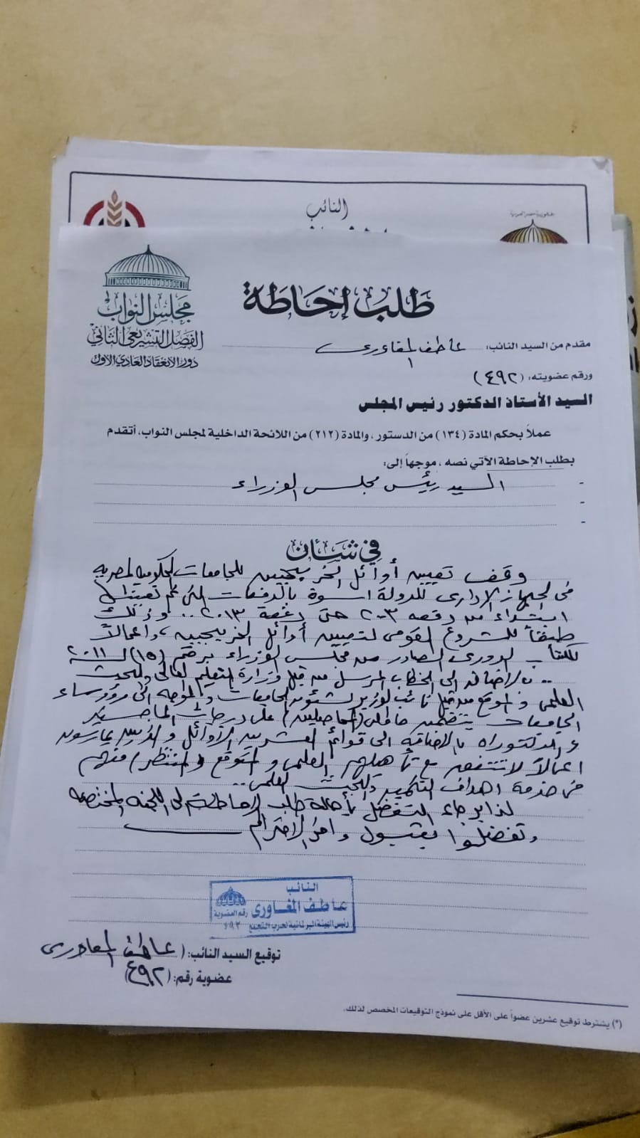 تقدم النائب عاطف المغاوري، عضو اللجنة التشريعية بمجلس النواب، ورئيس الهيئة البرلمانية لحزب التجمع، بطلب إحاطة إلى المستشار الدكتور حنفي جبالي رئيس مجلس النواب، وذلك بشأن وقف تعيين أوائل الخريجين، للجامعات الحكومية المصرية، في الجهاز الإداري للدولة.