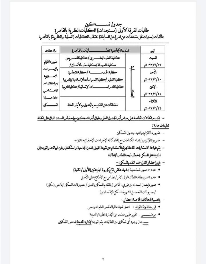 في الوقت ذاته، نشر المركز الإعلامي لجامعة الأزهر الشريف، ضوابط ومواعيد التسكين بالمدن الجامعية لجامعة الأزهر بالقاهرة، لجامعة الأزهر، وجاء حسب الجداول التالية: