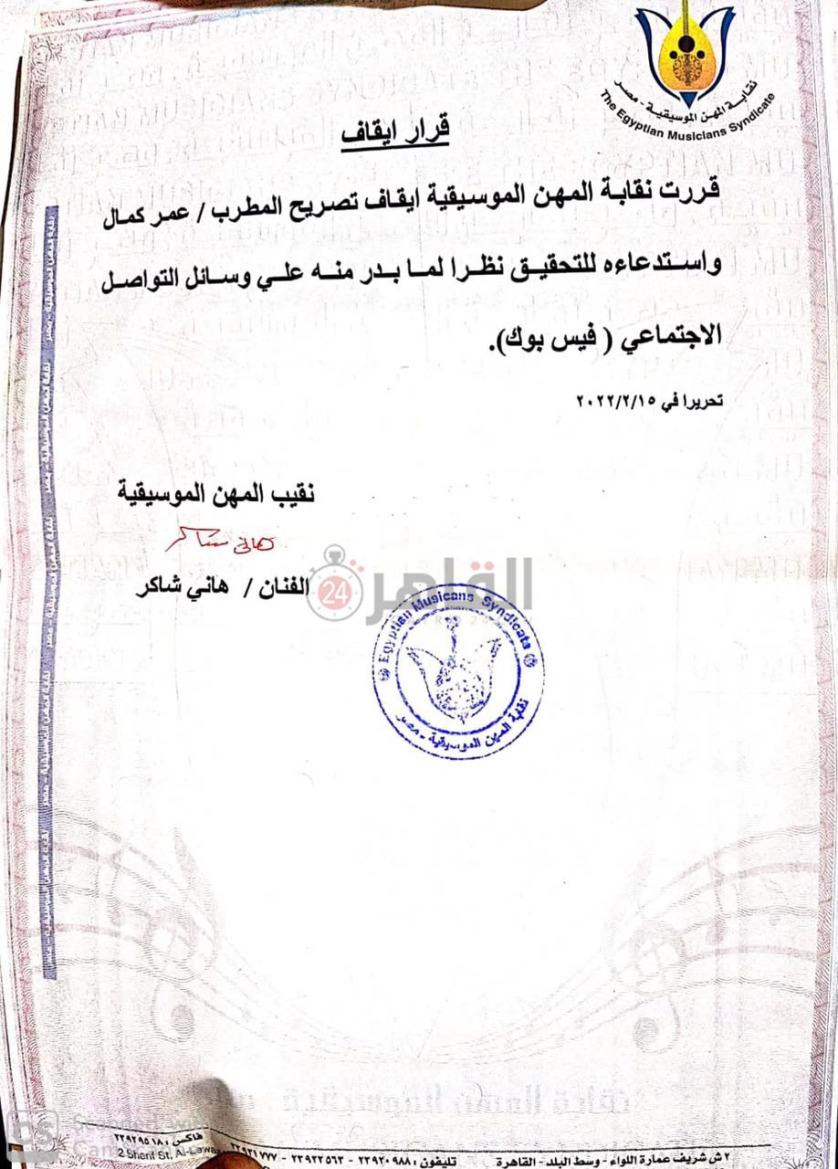 وحصل القاهرة 24، على مستند البيان الرسمي من النقابة، الخاص بإيقاف عمر كمال عن العمل، وجاء فيه: قررت نقابة المهن الموسيقية إيقاف تصريح المطرب عمر كمال، واستدعاؤه للتحقيق؛ نظرًا لما بدر منه على وسائل التواصل الاجتماعي فيسبوك.