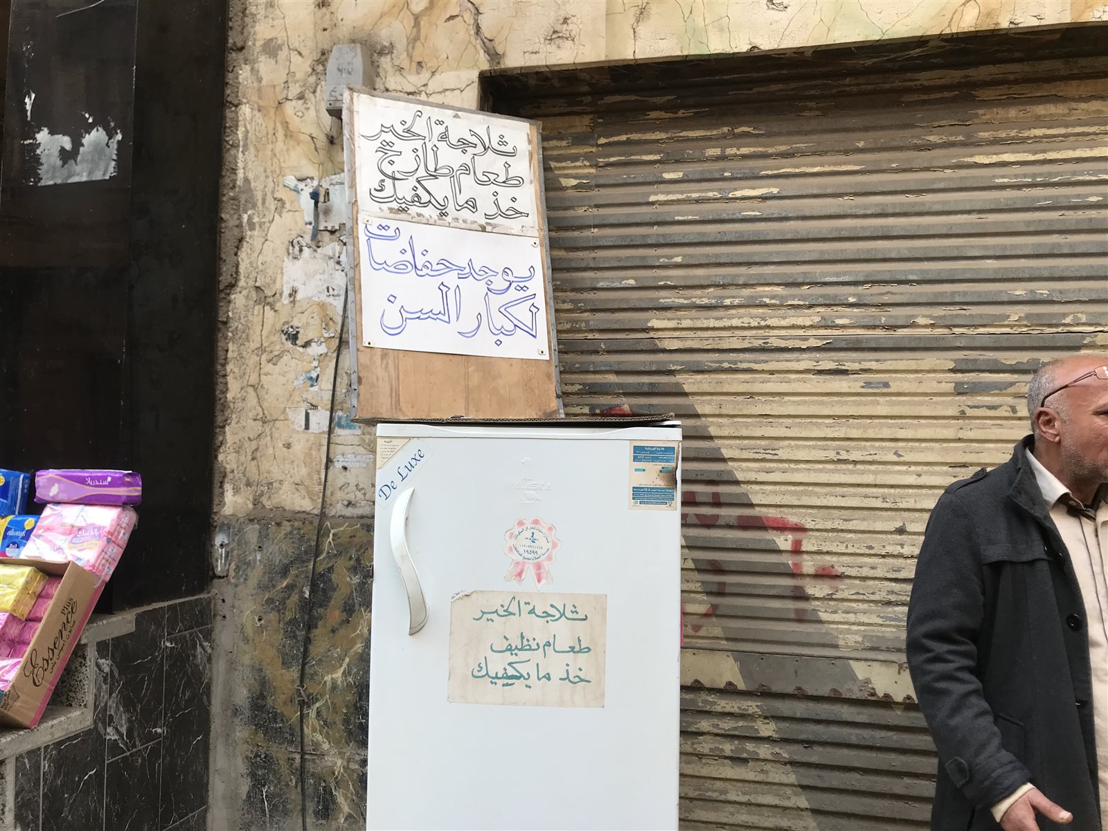 خذ ما يكفيك، عبارة زينت واجهة ثلاجة وضعت في أحد شوارع مدينة المنصورة في محافظة الدقهلية، كمبادرة من أحد أهالي المنطقة، لمساعدة المحتاجين في إيجاد طعام بكرامة دون الحاجة للنبش عن قوت يومهم في القمامة أو التسول ومد أيديهم للغير.
