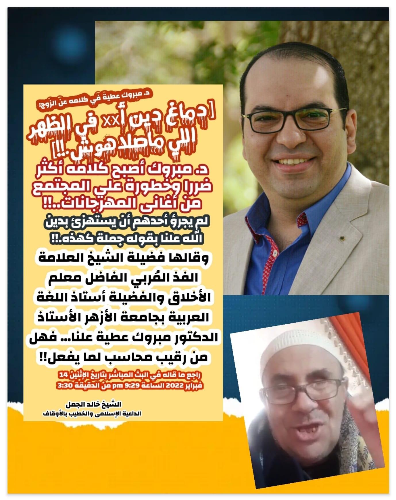 وأضاف الداعية الإسلامي: الشيخ الدكتور مبروك عطية أستاذ اللغة العربية بجامعة الأزهر يخرج في بث مباشر أمس علي صفحته الرسمية ليتكلم عن الزوج وزوجته العاملة ومدي تأثير ذلك علي بيته، وبينما هو يشرح ما يقوله إذا به ينطق بكلمة لم أكن أتصور أن أسمعها من شيخ أو داعية أو حتي مجرد متدين، فما بالك بمن يفترض في نفسه أنه أعلم العلماء وجهبذ الفقهاء في عصره، ظهر الشيخ ليقول بملئ فيه عن الزوج: دماغ دين أ.. في الظهر اللي ماصلاهوش.