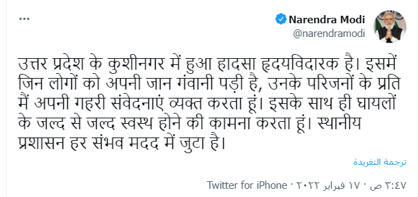 ووصف رئيس الوزراء ناريندرا مودي الحادث بأنه مؤلم، وأعرب عن تعازيه الحارة، داعيًا الشفاء العاجل لباقي مصابين.