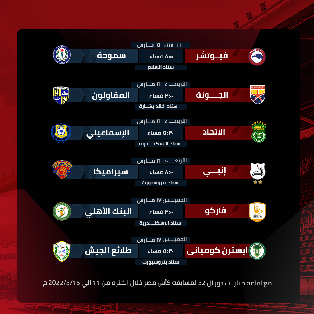 ومن المقرر أن تقام مباريات دور الـ 32 من منافسات بطولة كأس مصر، خلال الفترة من الحادي عشر من مارس وحتى الخامس عشر من ذات الشهر.