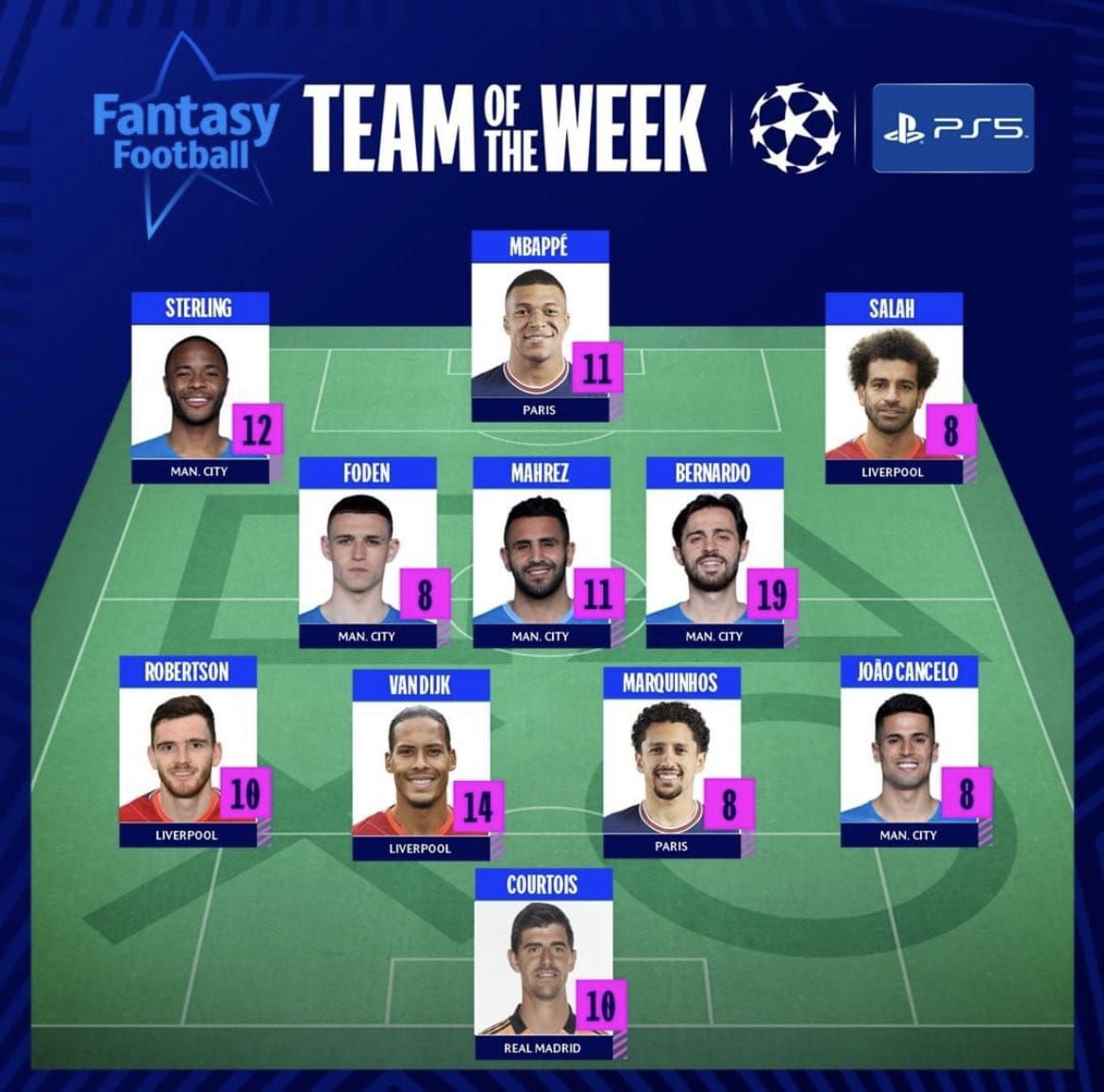 وشهد التشكيل الأفضل خلال الأسبوع في دوري أبطال أوروبا، استحواذ لاعبين الدوري الإنجليزي الممتاز، بوجود 5 لاعبين من فريق مانشستر سيتي، و3 لاعبين من فريق ليفربول.