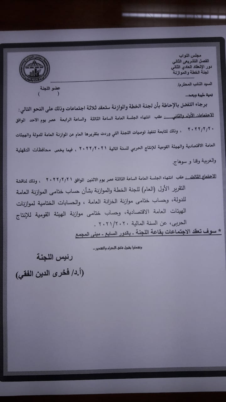 وأضاف وكيل لجنة الخطة والموازنة في مجلس النواب أن يوم الأحد سيتم عقد اجتماعين، بعد رفع الجلسة العامة، في المجلس، لافتًا إلى متابعة تنفيذ توصيات اللجنة، التي وردت بتقريرها العام، عن الموازنة العامة للدولة، والهيئات العامة الاقتصادية، والهيئة القومية للإنتاج الحربي، للسنة المالية 2021/2022، فيما يخص محافظات الدقهلية والغربية وقنا وسوهاج.