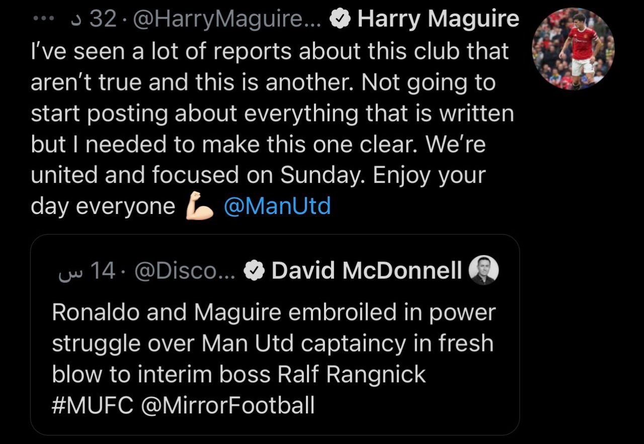 وكتب ماجواير على حسابه الرسمي على موقع التدوينات القصيرة تويتر: لقد رأيت الكثير من التقارير حول هذا النادي والتي ليست صحيحة وهذا شيء آخر، لن أبدأ في النشر عن كل ما هو مكتوب ولكني كنت بحاجة إلى توضيح هذا، نحن متحدون ونركز يوم الأحد.
