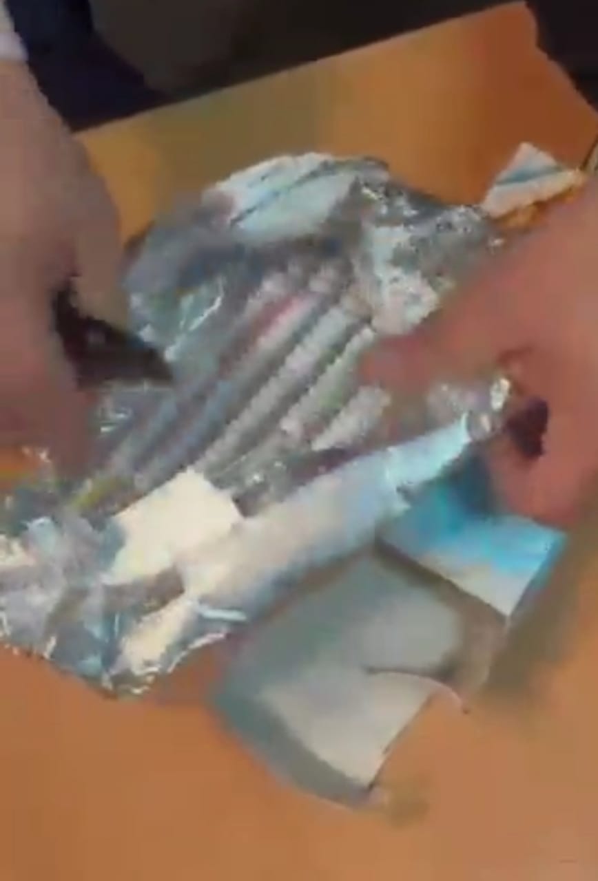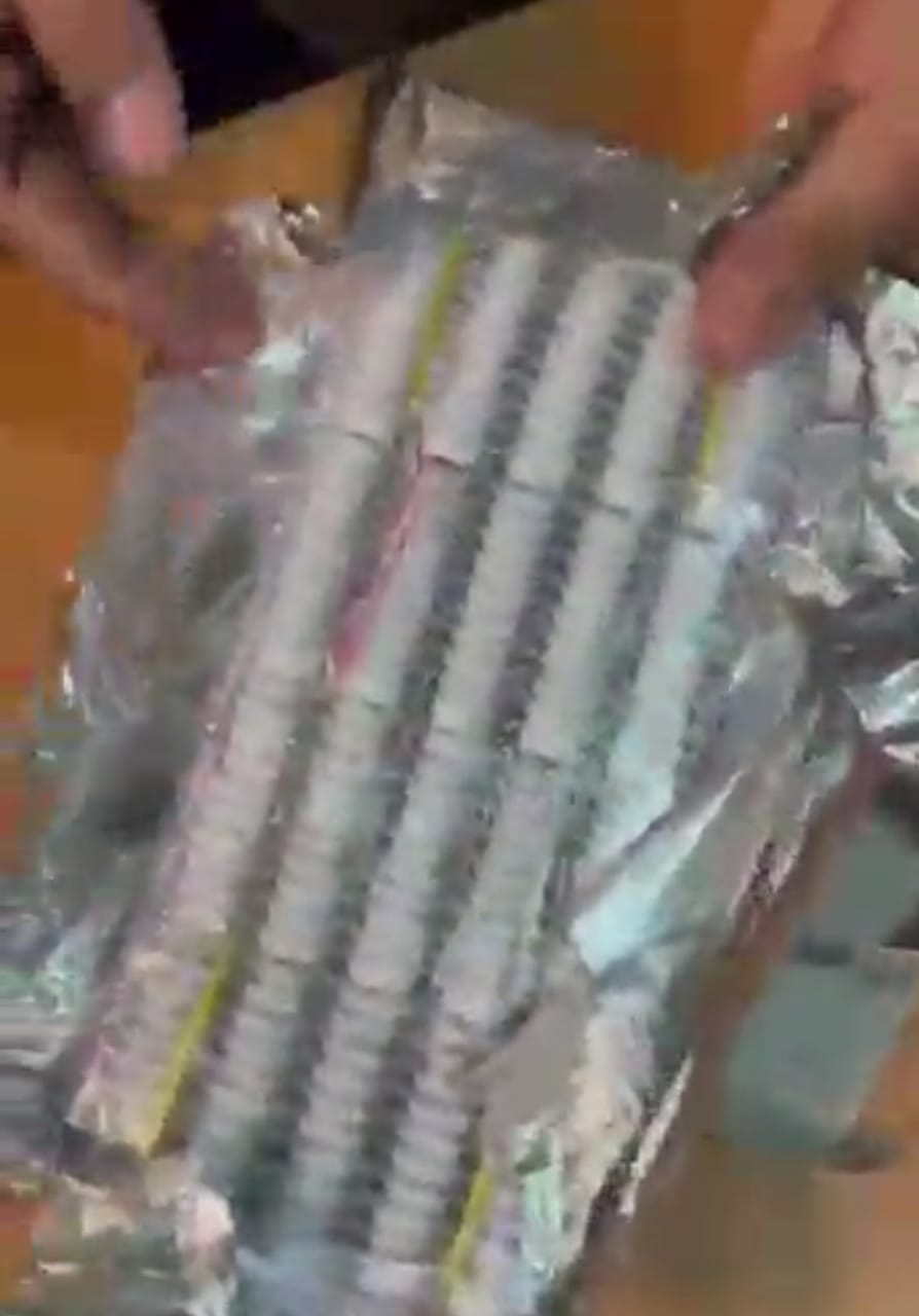 وتم تمرير حقائبه على جهاز الفحص بأشعة X-RAY بمعرفة محمد صلاح، مأمور الفحص، فتلاحظ وجود كثافات متماثلة في بعض العلب بإحدى الحقائب.