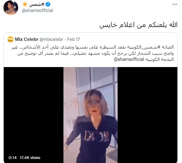 كما كتبت الفنانة تعليقا على أحد الأخبار التي نشرت الفيديو بعنوان شمس الكويتية، تضرب رجلا بعنف: لما يكون كاتب الخبر جنس عاشر مسخوط وهرموناته ملخبطة وأخذ 5 جرعات تطعيم إثيوبي.