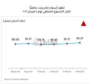ارتفع سعر خام برنت لـ النفط، كما ارتفع سعر خام غرب تكساس الوسيط الأمريكي بنهاية تعاملات الأسبوع المنتهي، في بداية شهر فبراير 2022.