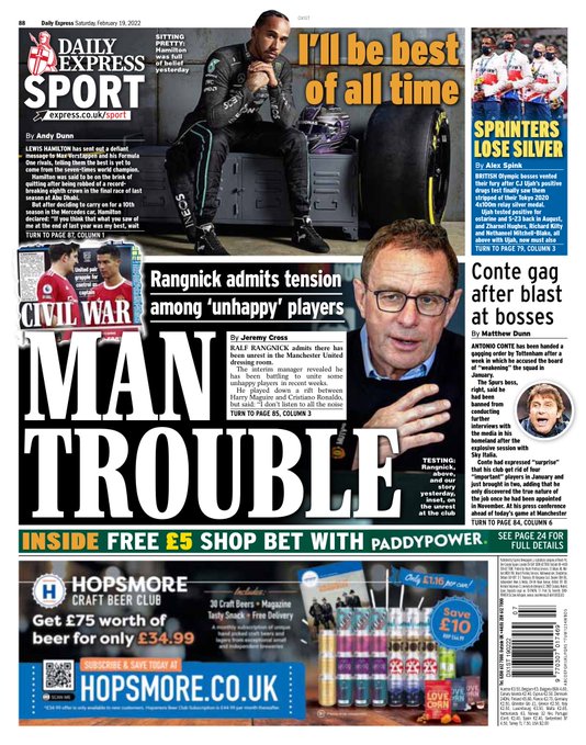 تصدر العنوان، مصاعب مانشستر يونايتد، غلاف ديلي إكسبريس، حيث أوضحت الصحيفة أن رانجنيك أكد وجود انقسامات وخلافات في الوقت الحالي بين اللاعبين.