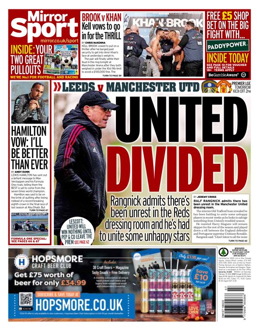عنونت ميرور غلافها بـ انقسام يونايتد، رانجنيك يكشف الخلافات في غرف ملابس مانشستر يونايتد ويسعى لتوحيدها.