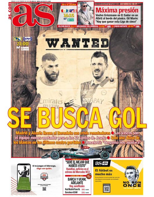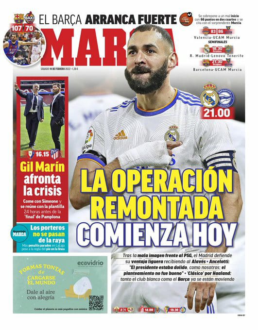 عنونت ماركا غلافها بعنوان، تبدأ عملية الريمونتادا، حيث أوضحت الصحيفة أنه بعد الصورة السيئة لريال مدريد أمام باريس سان جيرمان سيدافع الريال عن الفارق بالنقاط في الدوري عندما يستضيف ألافيس.