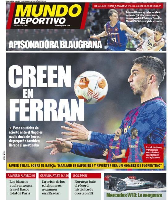 تصدر العنوان إنهم يؤمنون بفيران، غلاف موندو ديبورتيفو، حيث أشارت الصحيفة إلى أن الجهاز الفني لبرشلونة يؤمن بفيران توريس رغم الأداء الذي قدمه أمام نابولي وأهدر العديد من الفرص.