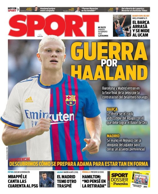 عنونت سبورت غلافها بـ الحرب من أجل هالاند.. برشلونة ومدريد يدخلان المرحلة الأخيرة من المعركة، للتعاقد مع المهاجم النرويجي.