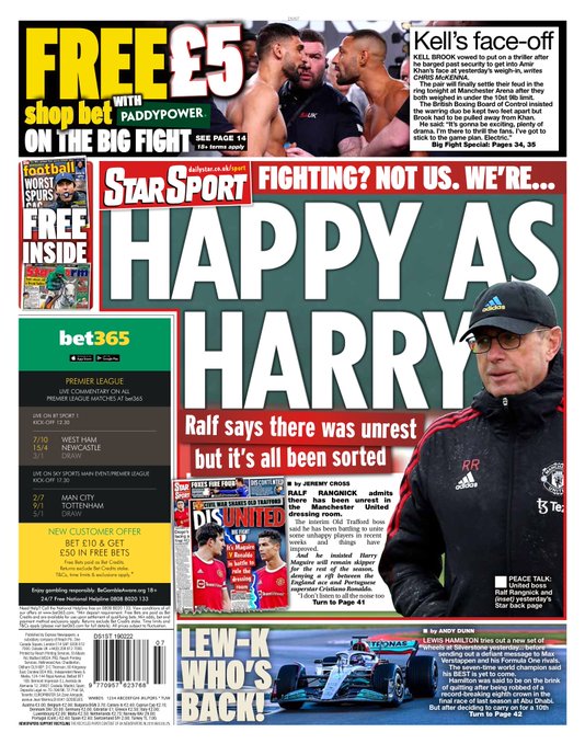 تصدر العنوان سعيد مثل هاري، غلاف الصحيفة اليوم، حيث أوضحت الصحيفة أن هاري مجواير وكريستيانو رونالدو لديهما صراعا في غرف ملابس الفريق في الفترة الأخيرة، بشأن شارة القيادة التي يحملها مجواير حاليًا.