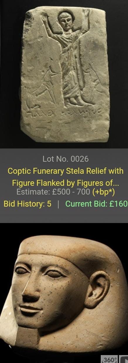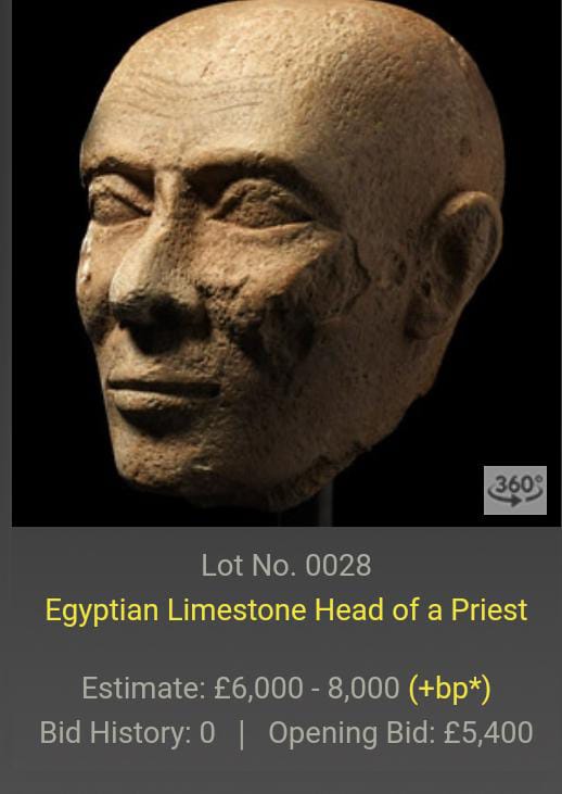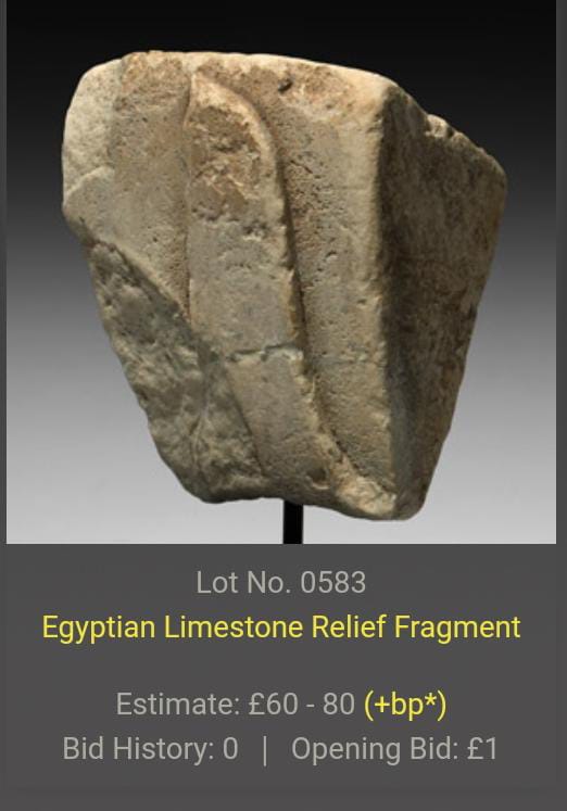 كشف المؤرخ بسام الشماع، المؤرخ في علم المصريات، عن بيع آثار مصرية في مزاد علني، بصالة مزادات عالمية تدعى تايم لاين Timeline Auctions.