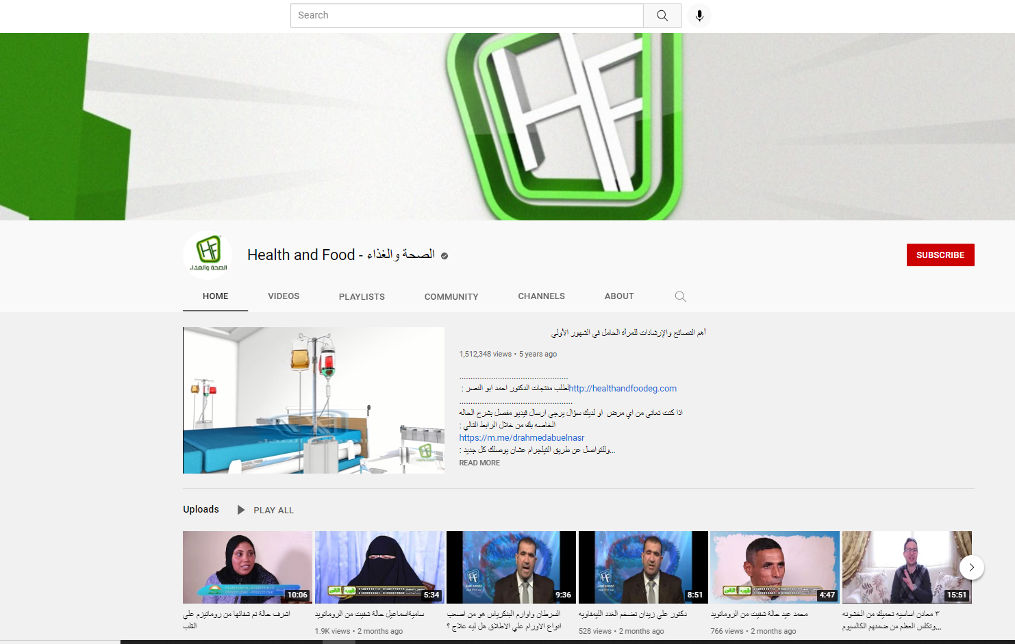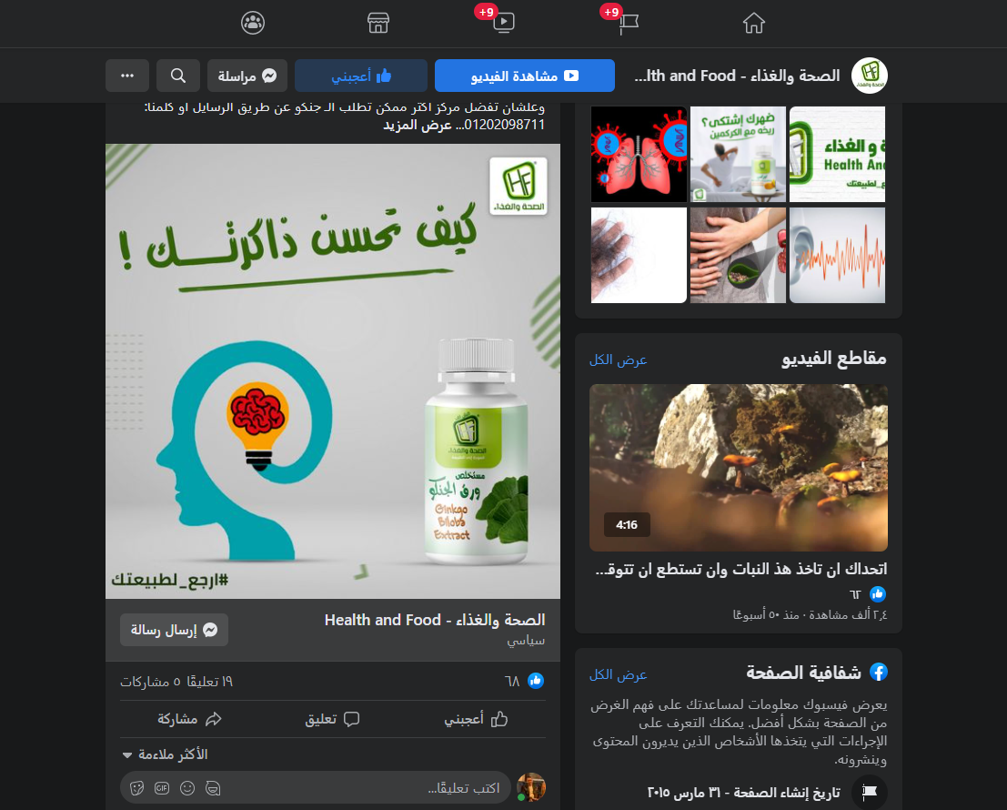 وقد أنشئت صفحة باسم الصحة والغذاء عبر موقع التواصل الاجتماعي فيسبوك، في 31 مارس 2015، تخصصت في بيع مستخلصات النباتات الطبية، وفقا لموقع الصفحة على فيسبوك.