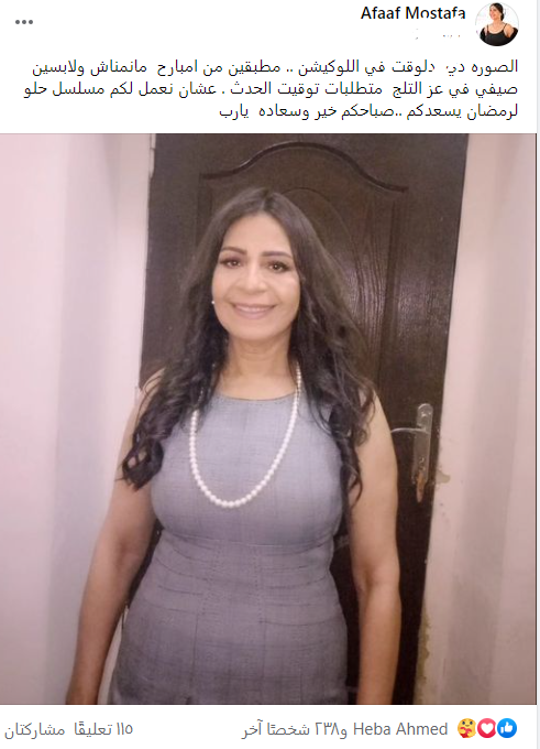 ونشرت عفاف مصطفى صورة لها، عبر حسابها الشخصي بموقع التواصل الاجتماعي فيس بوك، وعلقت عليها قائلة: الصورة دي دلوقتي في اللوكيشن.. مطبقين من امبارح منمناش، ولابسين صيفي في عز الثلج، متطلبات توقيت الحدث، عشان نعمل لكم مسلسل حلو لرمضان يسعدكم، صباحكم خير وسعادة يارب.