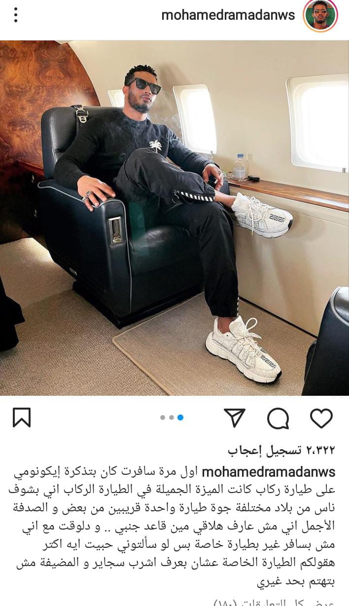 شارك الفنان محمد رمضان، متابعيه، صورًا جديدة له وهو على متن طائرته الخاصة، مشيرًا إلى أنه عندما سافر لأول مرة على متن طائرة بها ركاب؛ كانت الأجمل، ولكنه يفضل السفر بطائرته الخاصة في الوقت الحالي؛ بسبب اهتمام مضيفة الطيران به هو فقط.