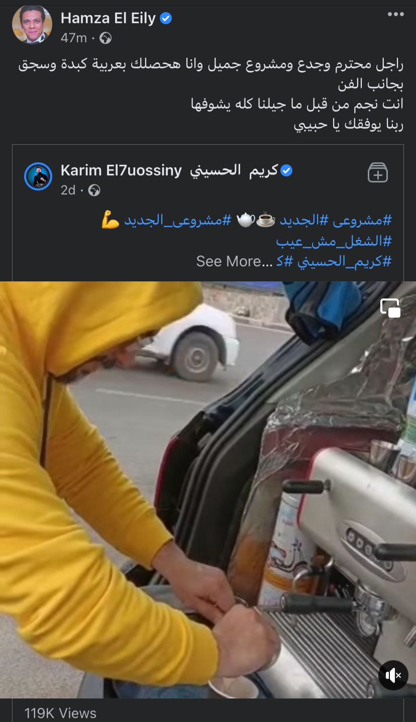 حرص الفنان حمزة العيلي، على دعم الفنان كريم الحسيني بعدما فاجأ الأخير جمهوره، بتحويل سيارته الخاصة لبيع المشروبات الساخنة في الشارع، بجانب عمله في المجال الفني.