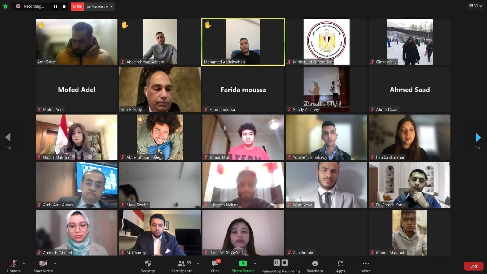 نظم مركز وزارة الهجرة للحوار لشباب المصريين الدارسين بالخارج حلقة نقاشية عبر تطبيق زووم، مع مجموعة من الشباب المصريين الدارسين بالخارج، أبناء الجيلين الثاني والثالث، بحضور السفيرة نبيلة مكرم وزيرة الدولة للهجرة وشئون المصريين بالخارج، والسفير عمرو عباس مساعد الوزيرة لشئون الجاليات، وبمشاركة عمرو القاضي رئيس هيئة تنشيط السياحة، للتعرف على جهود القطاع السياحي في مصر، والاستماع لأفكار الشباب الدراسين بالخارج للترويج إلى السياحة المصرية خارجيا.