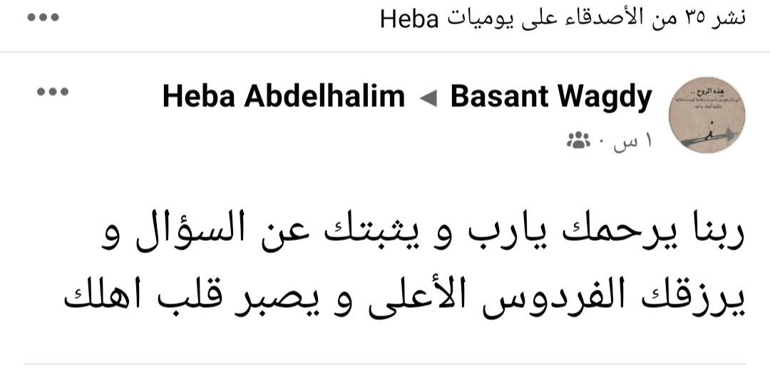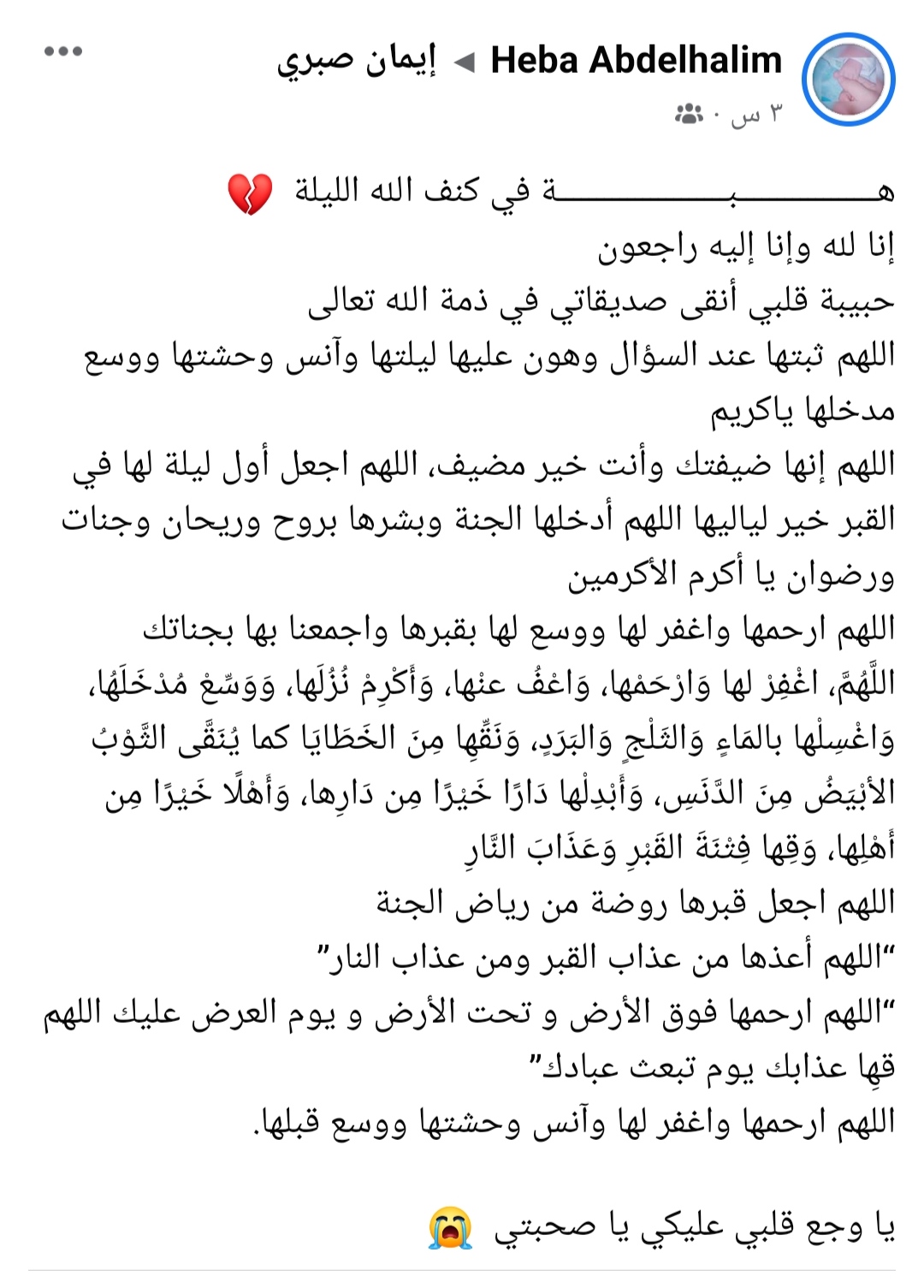 ونعت صفحة باسم إيمان صبري على موقع التواصل الاجتماعي فيسبوك صديق الراحلة: هبة في كنف الله الليلة إنا لله وإنا إليه راجعون، حبيبة قلبي أنقى صديقاتي في ذمة الله تعالى اللهم ثبتها عند السؤال، وهون عليها ليلتها وآنس، وحشتها، ووسع مدخلها يا كريم، اللهم إنها ضيفتك وأنت خير مضيف، اللهم اجعل أول ليلة لها في القبر خير لياليها اللهم أدخلها الجنة وبشرها بروح وريحان وجنات ورضوان يا أكرم الأكرمين، اللهم ارحمها واغفر لها ووسع لها بقبرها واجمعنا بها بجناتك.