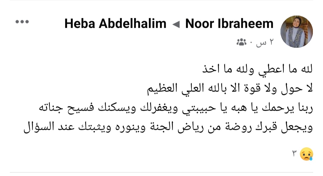 وبينما نعيت صفحة باسم نور إبراهيم على موقع التواصل الاجتماعي فيسبوك: لله ما أعطي ولله ما أخذ لا حول ولا قوة إلا بالله العلي العظيم، ربنا يرحمك يا هبه يا حبيبتي، ويغفر لك ويسكنك فسيح جناته ويجعل قبرك روضة من رياض الجنة وينوره ويثبتك عند السؤال.
