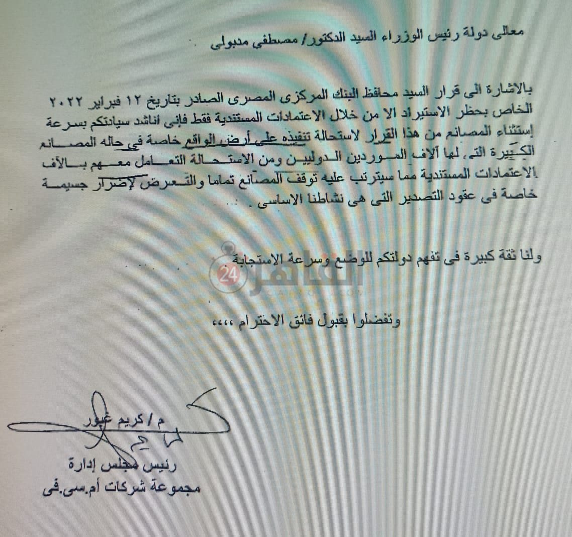 وورد في نص الاستغاثة: معالي دولة رئيس الوزراء السيد الدكتور مصطفى مدبولي، بالإشارة إلى قرارمحافظ البنك المركزي المصري، الصادر بتاریخ 12 فبرابر 2022 الخاص بحظر الاستيراد إلا من خلال الاعتمادات المستندية فقط.