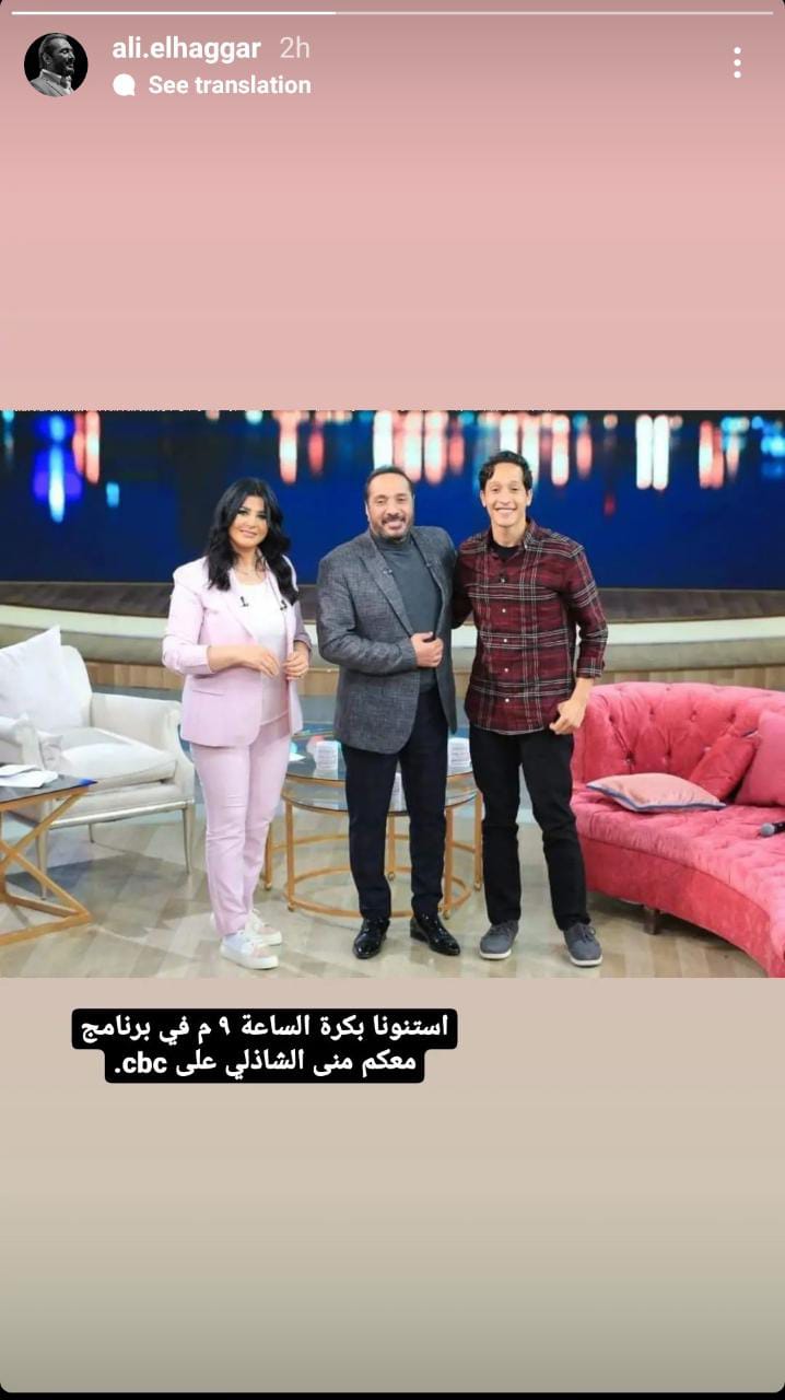 ونشر علي الحجار، صورة تجمعه مع ابنه والإعلامية منى الشاذلي، عبر خاصية استوري على حسابه الشخصي بـ انستجرام، وكتب: استنونا بكرة الساعة 9 مساءً في برنامج معكم منى الشاذلي على CBC.