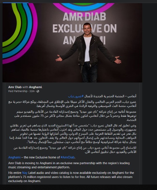 كشف الفنان عمرو دياب، عن توقيعه شراكة حصرية مع منصة أنغامى، لبث أغانيه التى تنتجها شركته ناى فور ميديا، وجميع إصداراته المقبلة من الأغانى حصرياً عبر المنصة، التى يستخدمها أكثر من 75 مليون مستخدم.
