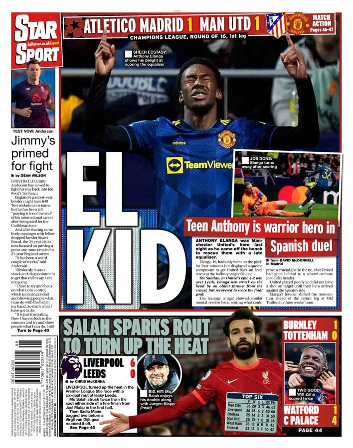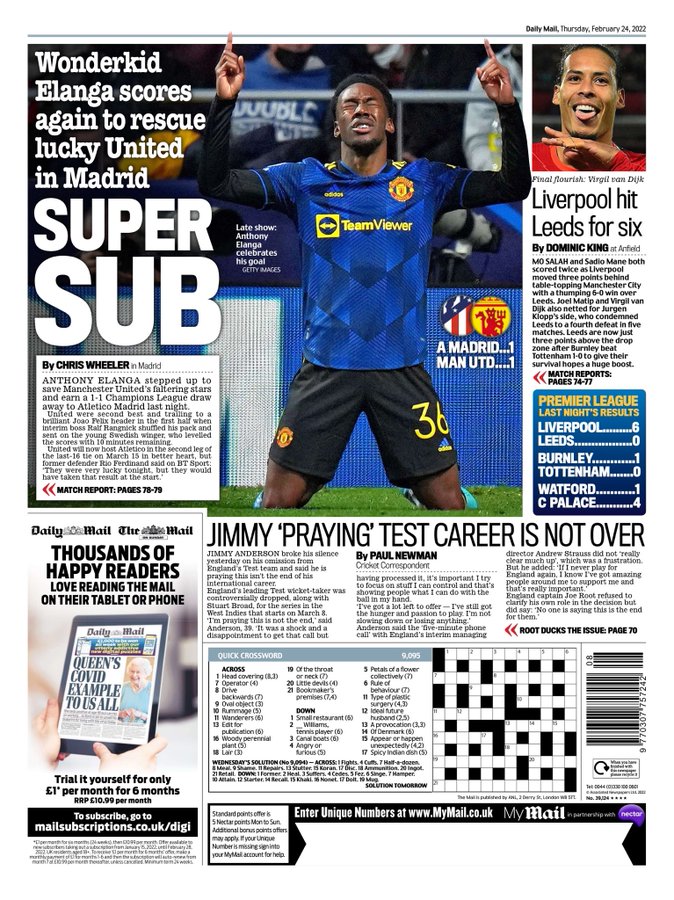 تصدر العنوان التبديل السوبر غلاف صحيفة ديلي ميل الإنجليزية لعدد اليوم، وذلك بإشارة إلى أن إيلانجا لاعب فريق مانشستر يونايتد كان بمثابة التبديل المميز مع الشياطين الحُمر أمام أتلتيكو مدريد أمس.