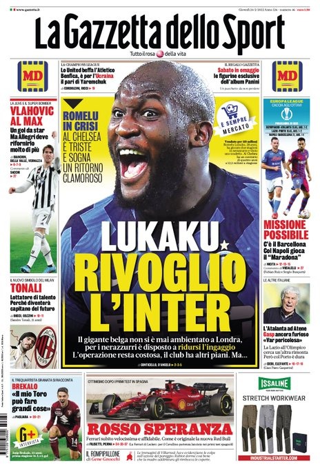 عنونت لا جازيتا في غلافها بـ لوكاكو يريد الانتر، وذلك في إشارة برغبة لوكاكو في العودة إلى إنتر ميلان في الفترة القادمة بعد تراجع أدائه مع تشيلسي، حيث لم يستقر البلجيكي أبدًا في لندن وهو مستعد لخفض راتبه للعودة إلى إنتر.