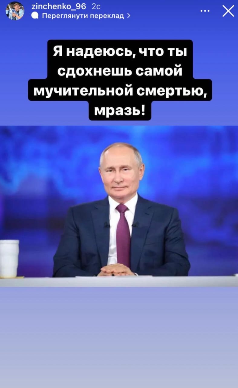 وكان ألكسندر زينتشينكو قد نشر عبر ستوري حسابه الرسمي على إحدى مواقع التواصل الاجتماعي انستجرام، صورة للرئيس الروسي بوتين، وعلق قائلًا: أتمنى أن تموت قريبًا بأبشع طريقة ممكنة، أيها المخلوق.