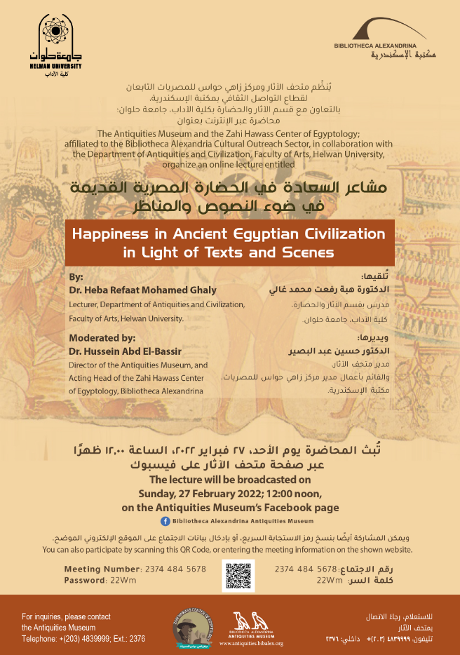 يعقد متحف الآثار، ومركز زاهي حواس للمصريات، التابع لـ مكتبة الإسكندرية، محاضرة جديدة، أون لاين، بعنوان مشاعر السعادة في الحضارة المصرية القديمة في ضوء النصوص والمناظر، وذلك بالتعاون مع قسم الآثار والحضارة بـ كلية الآداب جامعة حلوان.
