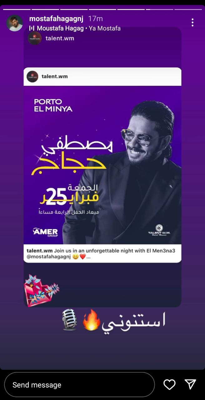 ونشر مصطفى حجاج على حسابه الشخصي بـ انستجرام عبر خاصية الأستوري، صورة له من بوستر الحفل وكتب: استنوني، وتقوم الحفل في بورتو المنيا في تمام الساعة 4 مساءً.
