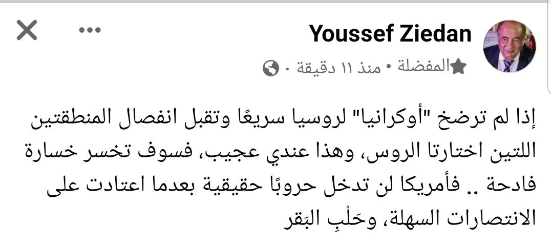 وكتب المفكر المصري الكبير، يوسف زيدان، عبر صفحته الرسمية على فيسبوك قائلًا: إذا لم ترضخ أوكرانيا لروسيا سريعًا وتقبل انفصال المنطقتين اللتين اختارتا الروس، وهذا عندي عجيب، فسوف تخسر خسارة فادحة.. فأمريكا لن تدخل حروبًا حقيقية بعدما اعتادت على الانتصارات السهلة، وحَلْبِ البَقر.