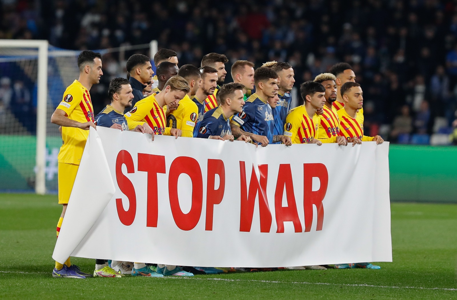 وشهدت بداية المباراة بين فريقي برشلونة ونابولي في منافسات مسابقة الدوري الأوروبي، لقطة إنسانية للاعبين الفريقين وهم يرفعون لافتة كتبوا عليها:أوقفوا الحرب، تضامنًا مع أوكرانيا، من أجل إيقاف الغزو الروسي ضدها.