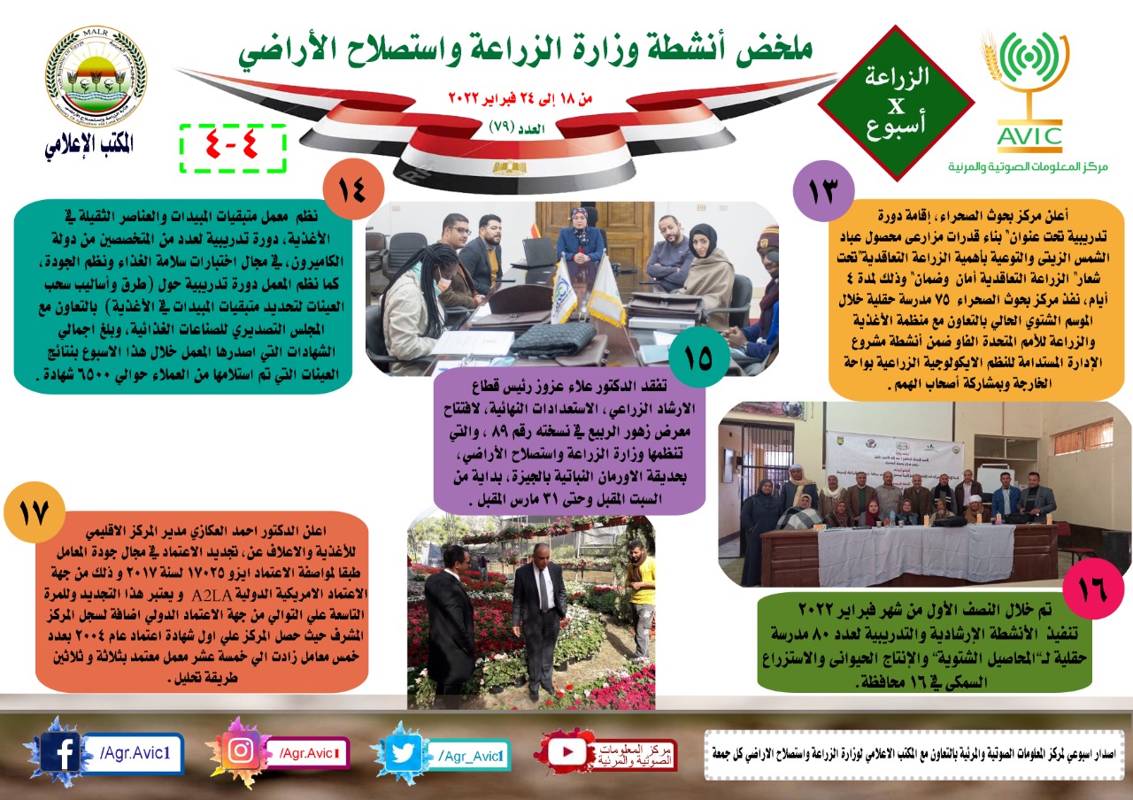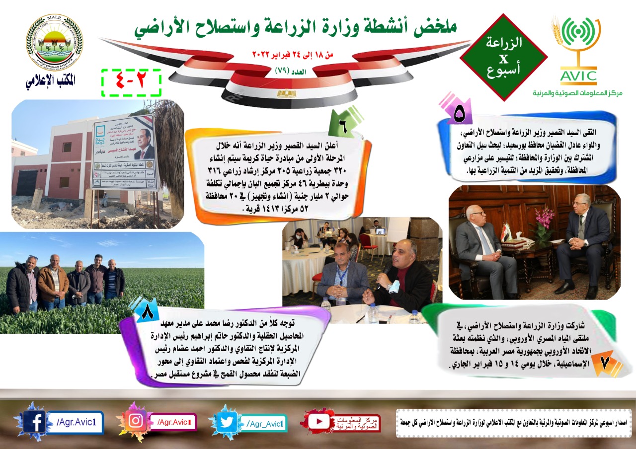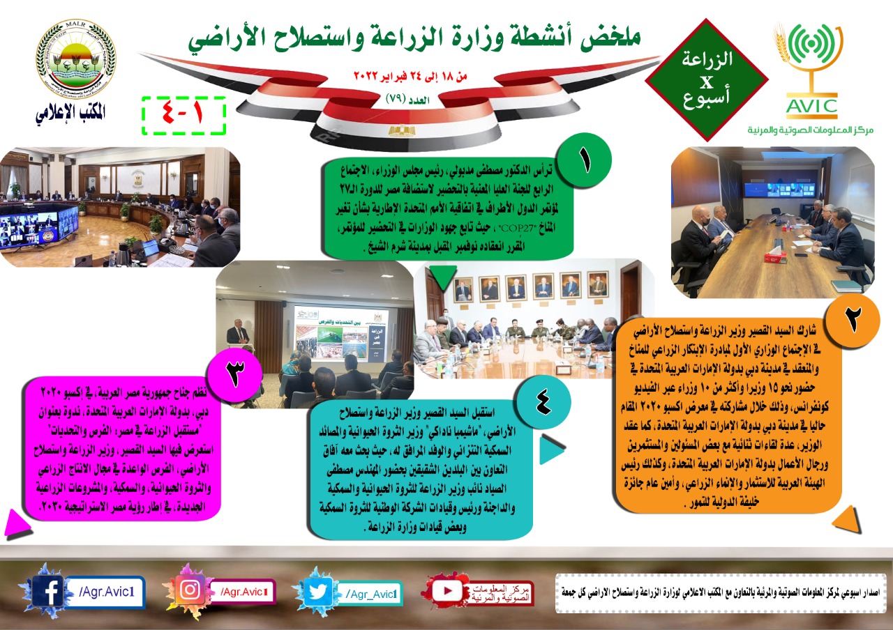أصدر مركز المعلومات الصوتية والمرئية، التابع لوزارة الزراعة واستصلاح الأراضي، الانفو جراف الأسبوعي، في نسخته رقم 79، المتعلق بالحصاد الأسبوعي لأهم أنشطة الوزارة، عن الأسبوع الماضي، في الفترة من 18 إلى 24 فبراير الجاري، وذلك بالتعاون مع المكتب الإعلامي للوزارة، كما أصدر المركز أيضا مُلخَّصًا بالفيديو، حول أنشطة الوزارة خلال الفترة نفسها.