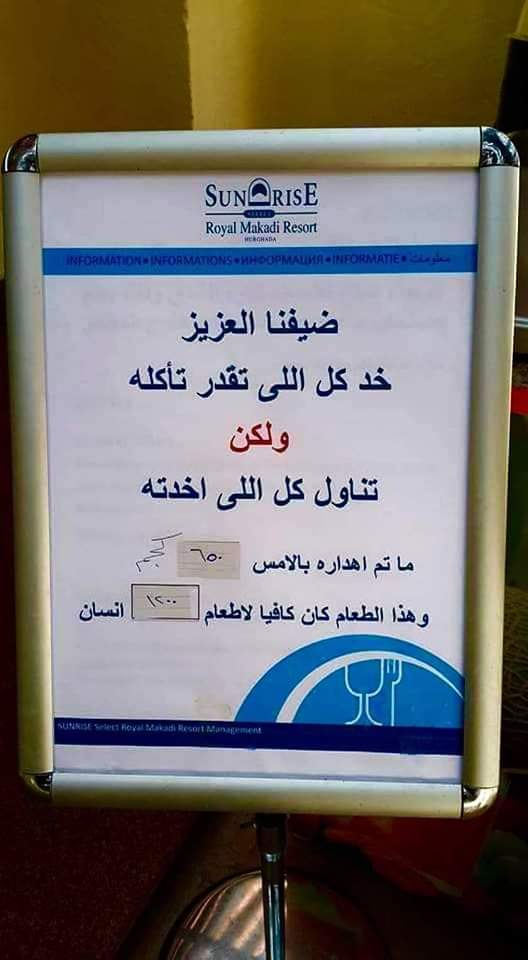 رفع منتجع سياحي جنوب مدينة الغردقة، بمحافظة البحر الأحمر، لافتة، مكتوب عليها: خد كل اللي تقدر عليه.. ولكن تناول اللي أخدته، وذلك لمنع إهدار الطعام.
