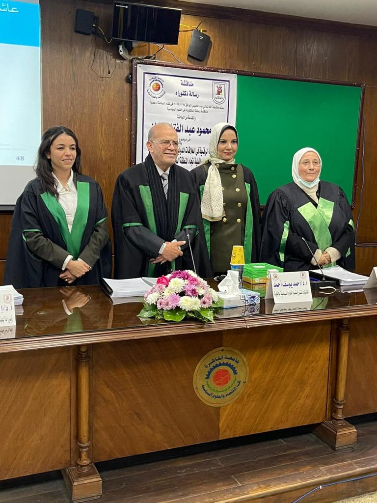 وناقش الرسالة على مدى نحو ثلاث ساعات، كلا من الدكتور أحمد يوسف أستاذ العلاقات الدولية بكلية الاقتصاد والعلوم السياسية بجامعة القاهرة، رئيسًا وعضوًا، والدكتورة إيمان رجب رئيس وحدة الدراسات العسكرية والأمنية بمركز الأهرام للدراسات السياسية والاستراتيجية، عضوًا.